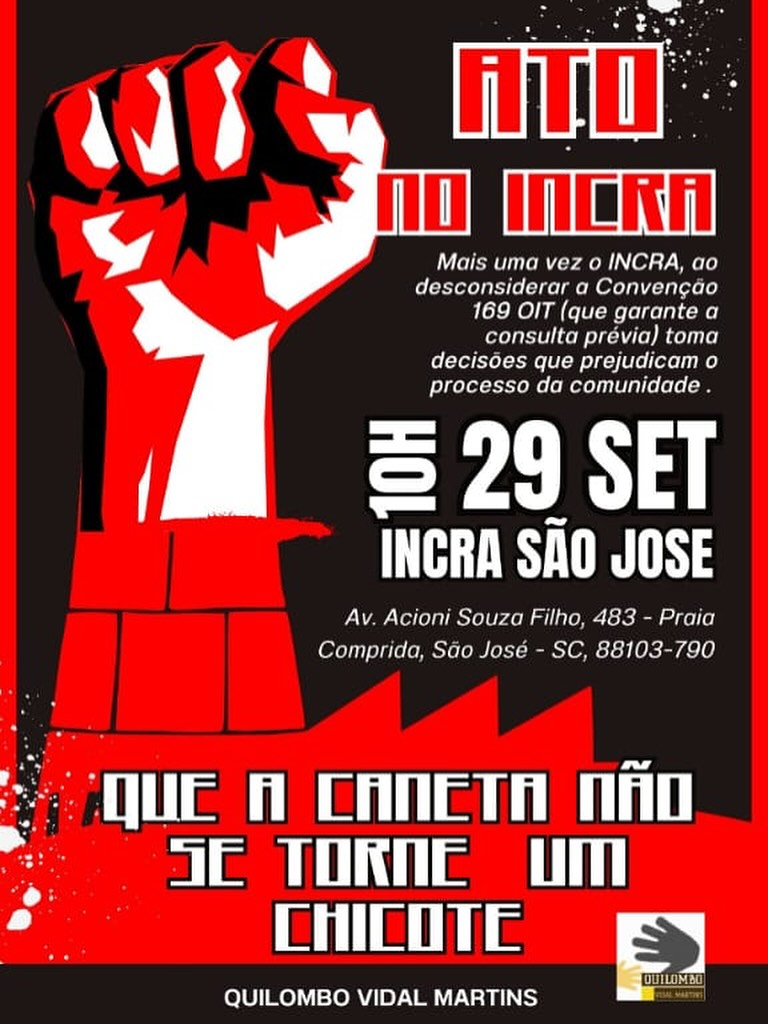 O Quilombo Vidal Martins está chamando um ato no INCRA de São José, nesta segunda 29/09 às 10h.